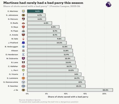 公平地说,这次失误在整体射门扑救层面上仍属个例。达米安-马丁内斯在这一领域依然处于顶级水准。借助足球分析公司 Gradient Sports 的数据,可以评估本赛季英超出场时间超过900分钟的门将中,“不理想扑救”所占的比例。